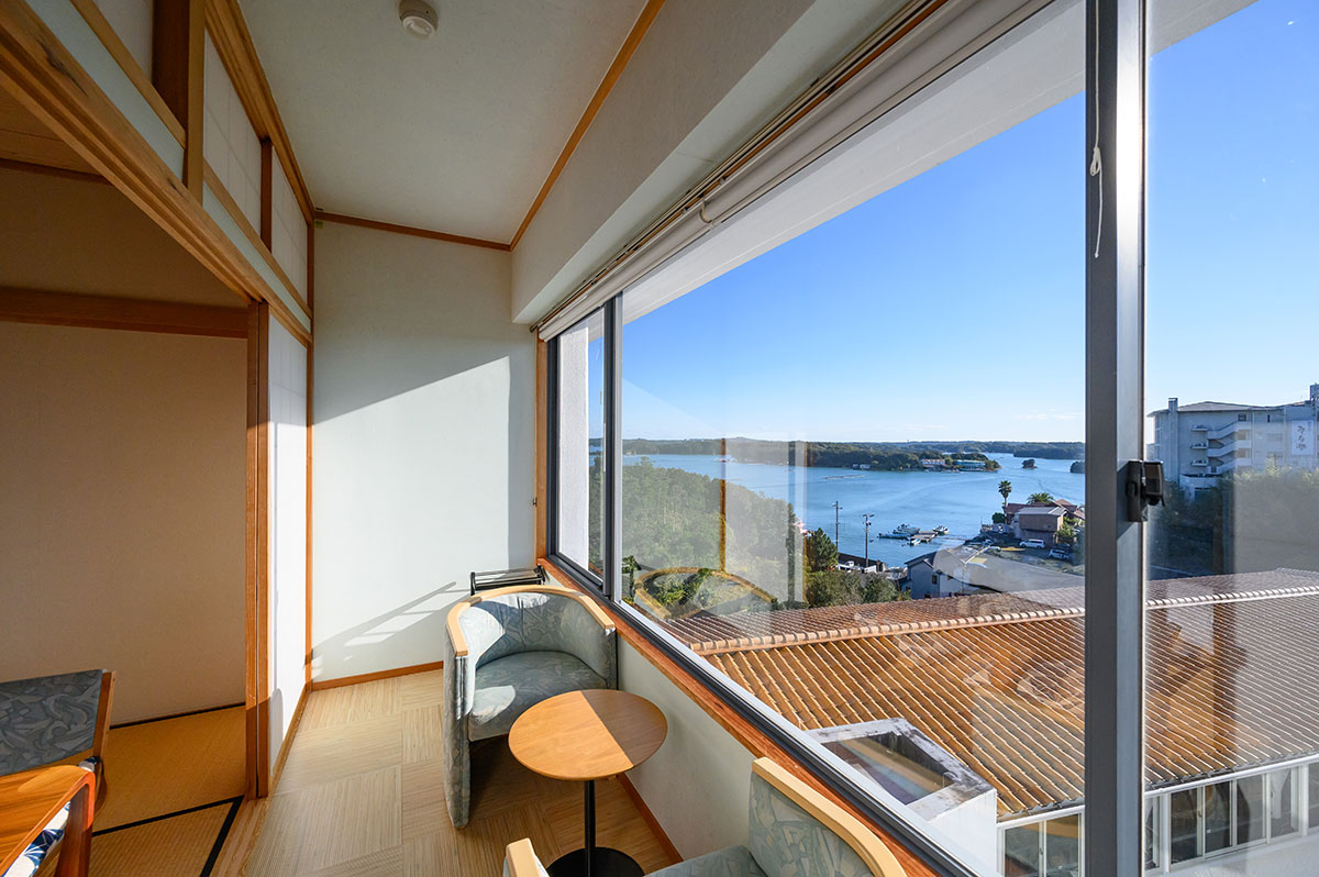 全面窓の開放的な人気の和室です。英虞湾ビューで、左手前方に英虞湾の波静かな風景を望むことができます。
